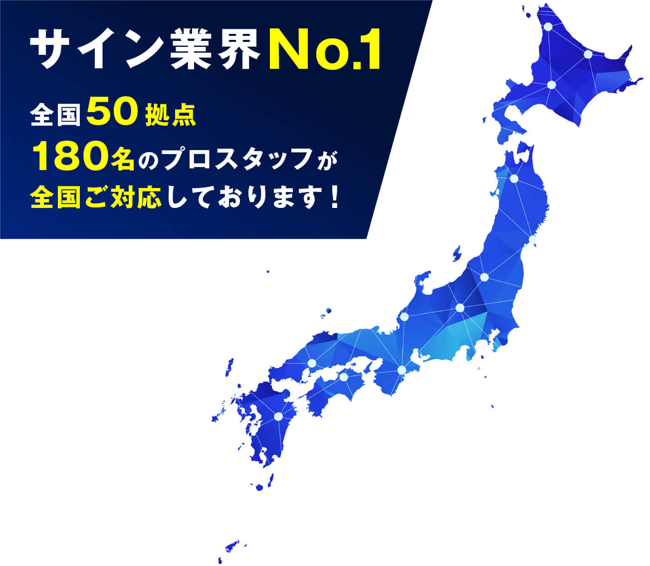 東京や名古屋・福岡など全国に展開しておりますグループ50拠点を最大限に活用し、 看板業界では非常に少ない全国ご対応が可能な看板屋を実現しております!